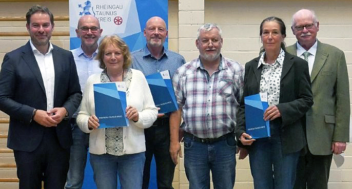 Übergabe der Förderbescheide in Breithardt: (v.l.) Landrat Sandro Zehner, Jo Friedrich (Wambach), Angelika Wilhelm (Schlangenbad), Dr. Cord Meyer (Obergladbach), Martin Eßrich (Schlangenbad), Irmgard Schade (Wambach) und Thomas Zarda (Dezernent für Demographie im RTK).