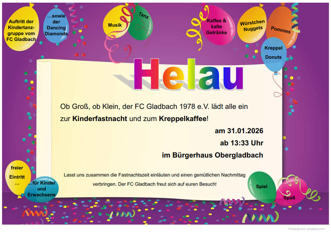 Der FC Gladbach lädt wieder zu Kinderfastnacht und Kreppelkaffee ein. Das närrische Treiben im Obergladbacher Bürgerhaus findet am Samstag, 31. Januar, statt. Beginn ist um 13.33 Uhr. Auf dem Programm stehen unter anderem Auftritte der Kindertanzgruppe des FC Gladbach und der Dancing Diamonds. Für das leibliche Wohl ist natürlich ebenfalls gesorgt, der Eintritt ist frei.